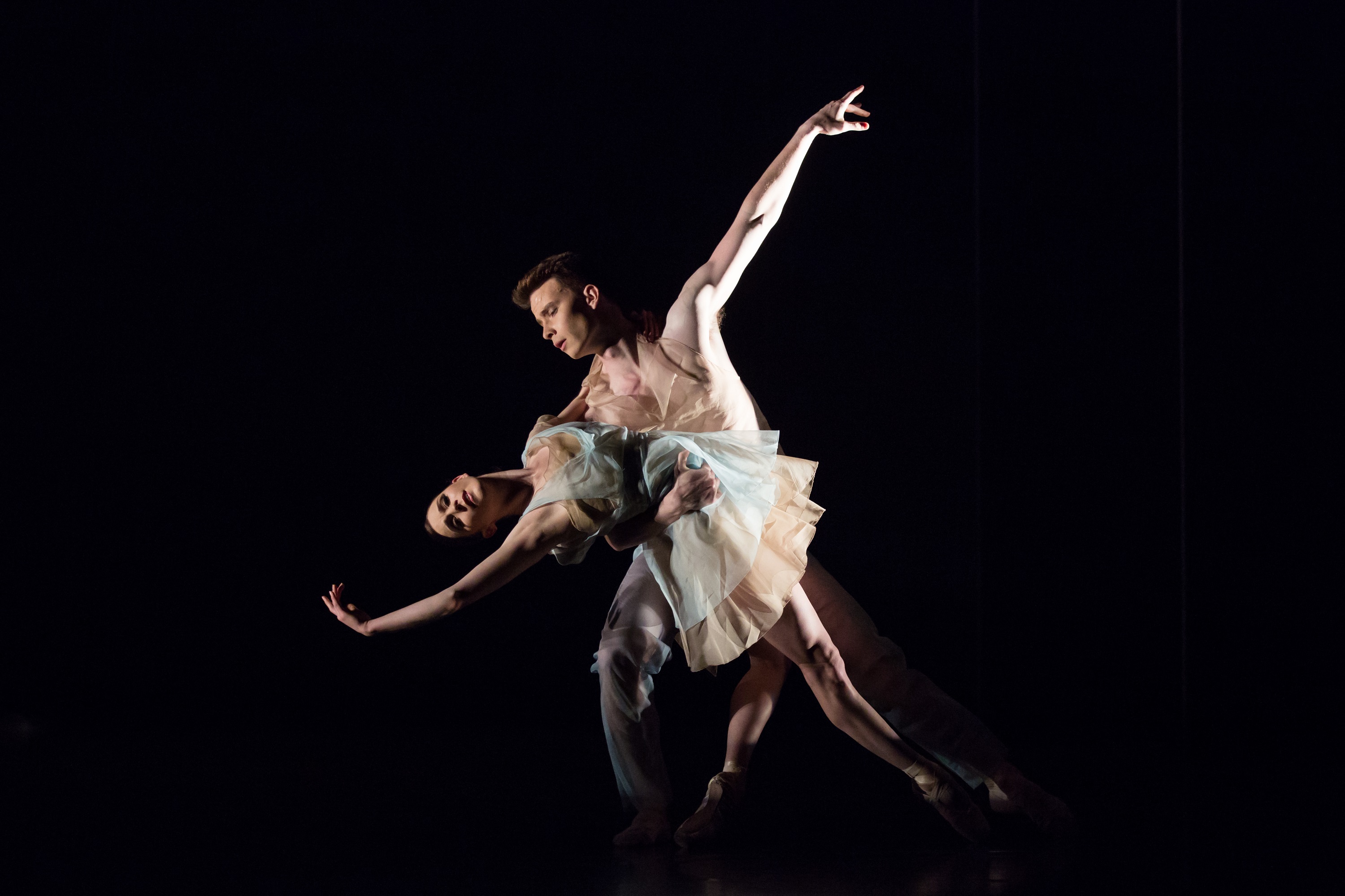 Monotones II, which opens the program, is a trio for one woman and two men made in 1965 for a gala, no less. It must be one of the most enduring works ever made for such an event. Ashton was inspired by 1960s moon exploration and the way people might move in its tenuous gravity. The woman – refined, poised soloist Natasha Kusen in the first cast – could be some kind of remote goddess attended by her male acolytes. Certainly the three appear suitably alien, clad entirely in second-skin white bodysuits and caps.