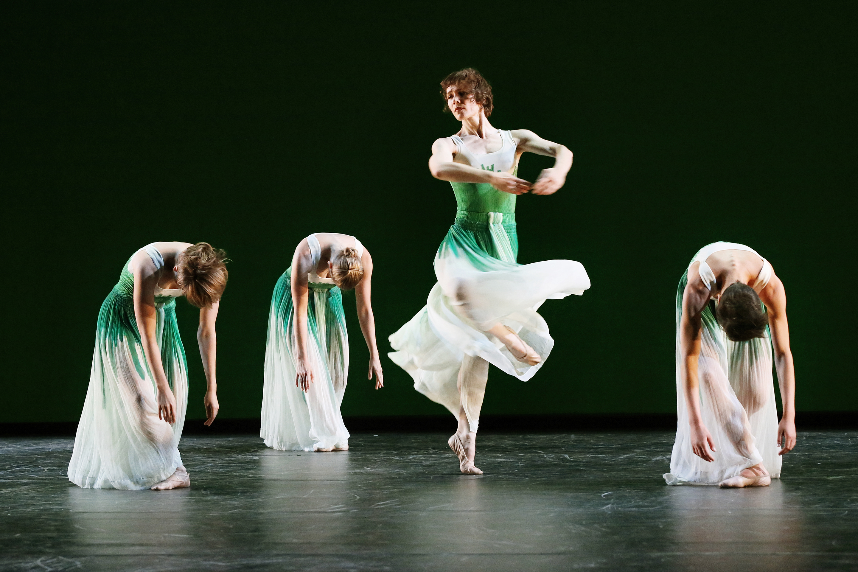 All of this made Morris’s newest work, Whelm, the wonderful surprise in this Sydney program of four works. Whelm, which premiered in New York only six weeks before its Sydney appearance, dwells in the dark and is strange and mysterious, hinting at conflict and death. Three enigmatic Debussy solo piano pieces propel a quartet in which tight interaction between somberly clad dancers alternates with moments of menace and uncertainty, and the movement switches without notice from flowing balletic turns and leaps to spiky, angular gestures or robotic walks. The pale faces of the dancers stand out spookily from their crepuscular costumes, even that of the woman who is veiled as if in mourning. There are hints of German Expressionist film in jerky movements (I loved the twitches of the lower arm that seem to come out of nowhere) alongside spins and jetes executed at frantic speed.