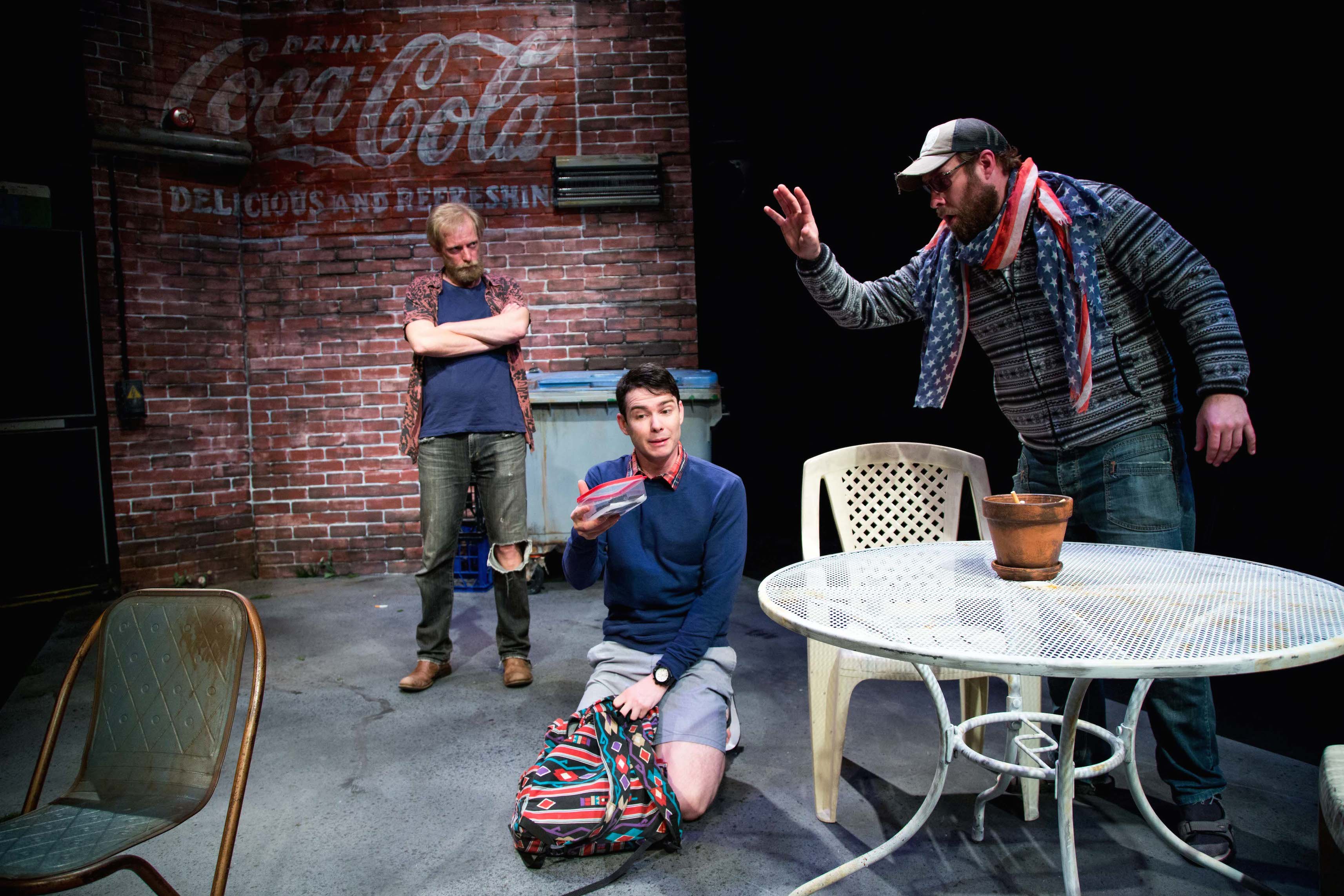 KJ (Ben Wood) and Jasper (Jeremy Waters) hang out in the cruddy garbage area at the back of a café and shoot the breeze about music, writing (Jasper is a Charles Bukowski aficionado) and relationships in a patchy, tentative, affectionate kind of way. Their conversation is all stops, starts and gaps but far from empty. Hurt, aspiration, bravado and need are often expressed as much in what is not said as what is.