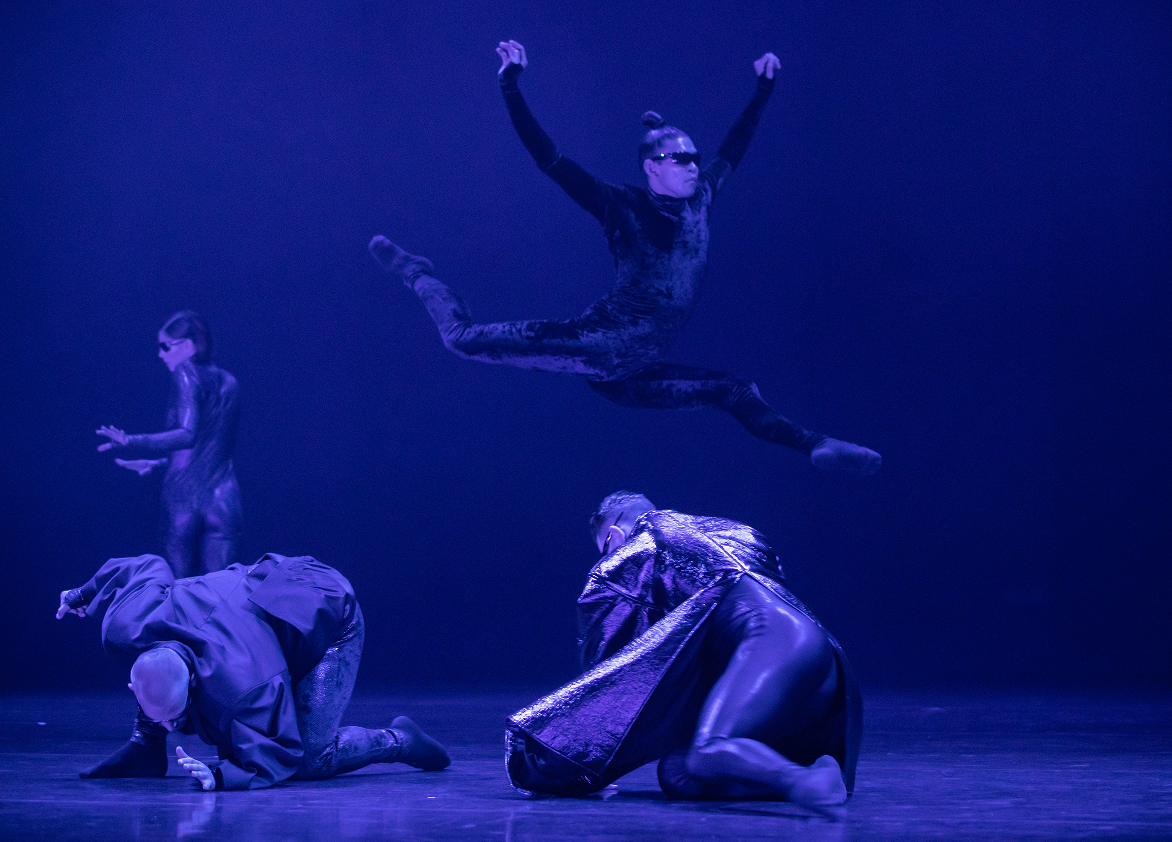 Clegg-Robinson is soon joined by others, at first seen bathed in red light as if the zombie apocalypse has arrived. Clark’s intensely layered electronic score starts up and we’re off. Six bodies huddle, shudder and shuffle. They are often jittery with bobbing heads and tiny little robotic steps. Sometimes they form a militaristic-looking pack and then lean back as if recoiling from what they are about to see or do, or have done to them. They arrange themselves into couples and trios and fracture again. There are touches of unison, some images of tender support and others of attack. It is exhilarating.