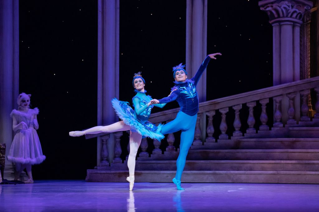 Characters are woven tightly into the action to pleasing effect. As the curtain rises we see that the King’s major domo Catalabutte is, in fact, a cat and so is his wife, Lady Florine (the excellent Rian Thompson and Sophie Zoricic in the first cast). Naturally they dance the variation for pusses in Act III, placed here just after the Blue Birds pas de deux. Catalabutte shows a great deal of interest in the birds, needless to say, to the delight of the audience.