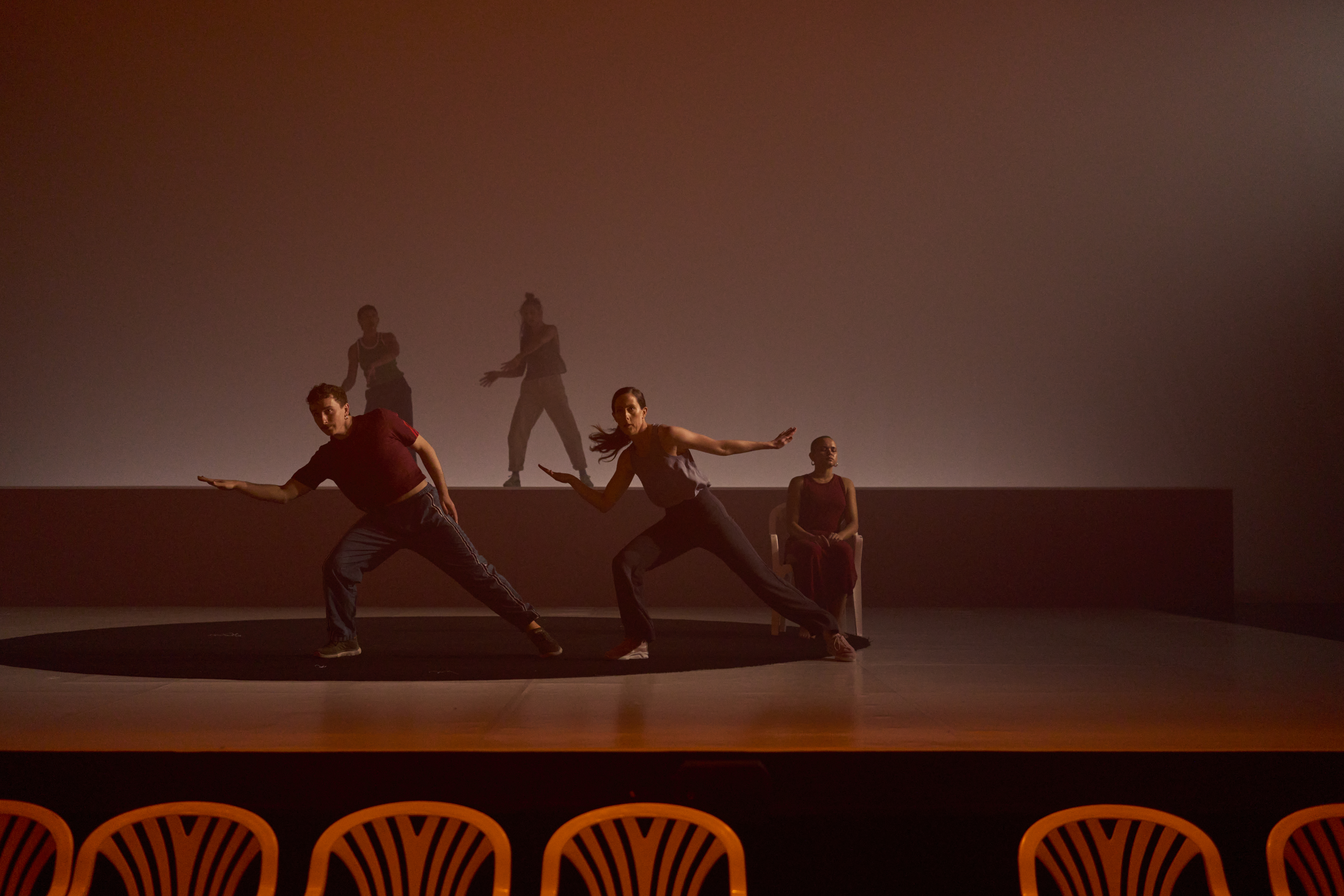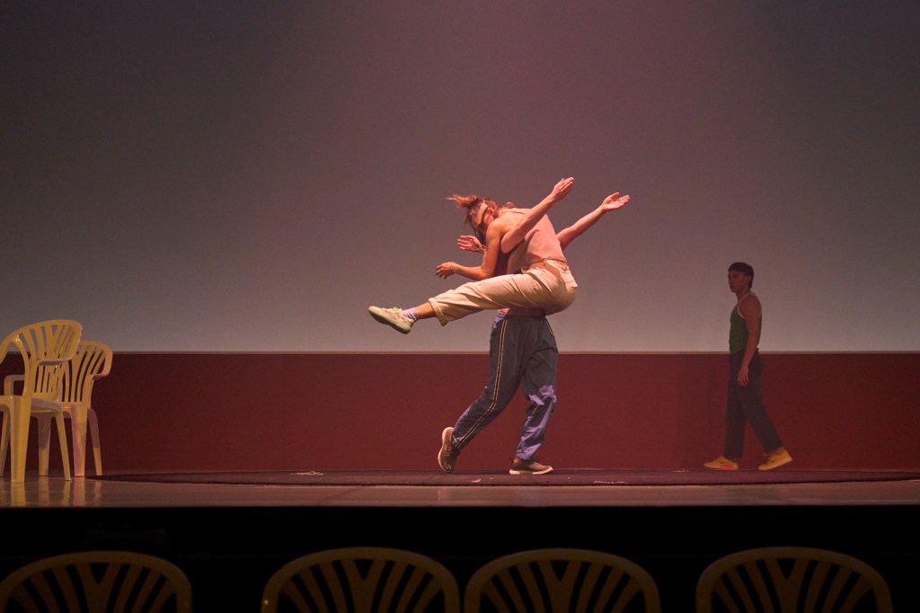 Sebastian Geilings enters via the auditorium, pulls up a chair for Narkle to sit on and the dance proper begins as a second chain-link fence is pushed across the stage, sweeping chairs before it.