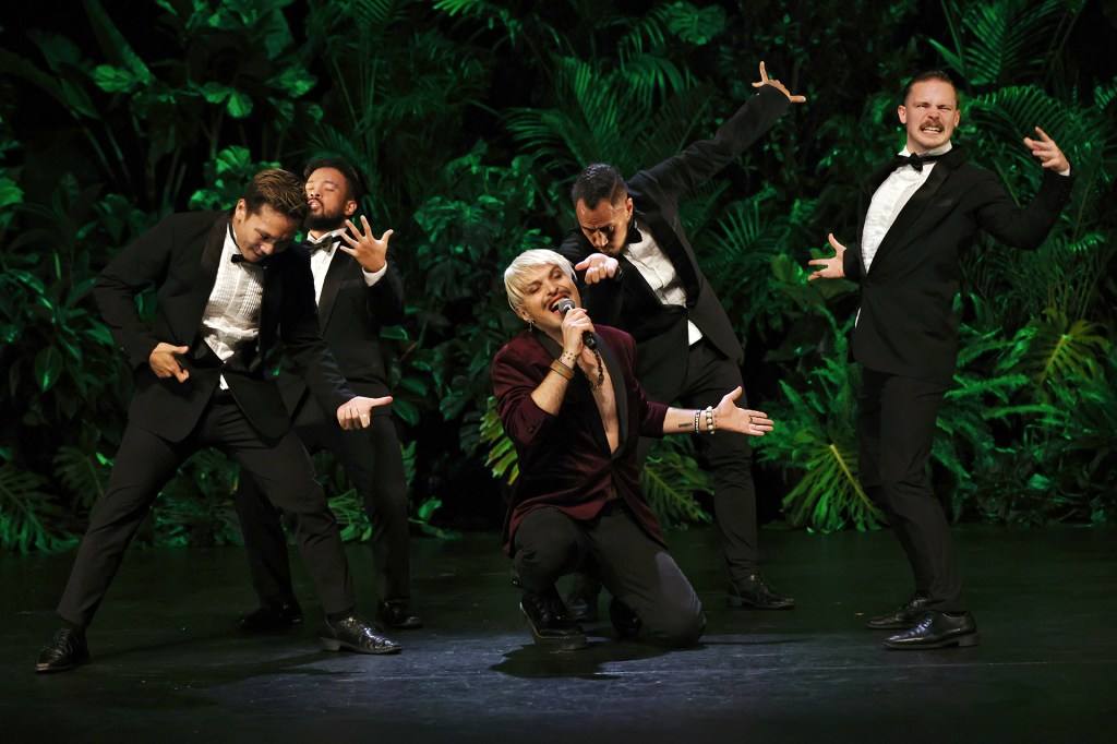 Dimchev starts the show gently with a song and finishes it emphatically with a forceful gesture. He is ever-present, a narrator of sorts in this presentation of male pressures and ways of being. His voice is exceptionally beautiful as it ranges from warm baritone to ethereal falsetto, the glowing beauty at the top of his range often decorated with a gorgeous, shimmering trill.