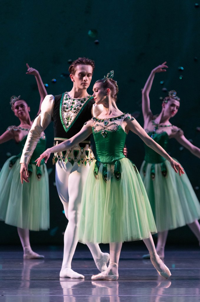Balanchine’s necklace of three gorgeous ballets inspired by precious stones put the sword to the understanding that a three-act ballet must have a narrative. In Jewels the only story is the one individual viewers create for themselves from worlds of mood, atmosphere, and suggestion. Emeralds is, if you like, a walk in a mysterious, enchanted forest to the gentle sounds of Fauré. Fizzy, showbizzy Rubies is ballet dialled up to 15 and powered by Stravinsky. Diamonds pays glorious tribute to the Russian Imperial era and to Tchaikovsky – and, inter alia, to TAB’s diamond anniversary.