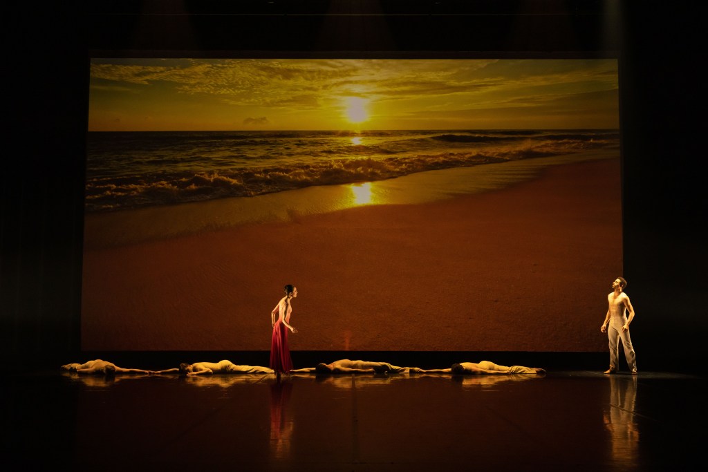 Weir used the seasons and the ebb and flow of the sea as metaphors for our awareness of mortality. Principal artist Lucy Green was dressed in the red of the setting sun while four other women were dressed alike in Noeline Hill’s simple dresses, each in a different colour alluding to a season. Green – the dancer, not the colour – was partnered by fellow principal Patricio Revé, he like the four other men in a neutral colour to suggest, as Weir wrote in her program note, grains of sand on the beach. Any man or Everyman, if you will.