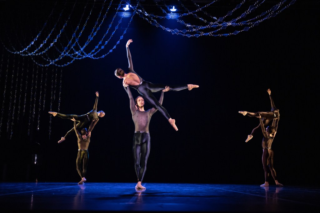Adelaide-born Wörtmeyer is a Europe-based choreographer who started his dance career at The Australian Ballet where he was always a tremendously vivid presence. Afterwards he became a star at Dutch National Ballet. He’s an artist too, and designed Miroir’s costumes and the spare but effective set of glittering, hanging loops. The dancers looked wonderful in shiny metallic unitards with discreetly sparkling belts and extremely glamorous (and sexy) plunging backs for the women and see-through tops for the men. Each couple was differentiated by subtly different coloured dancewear.