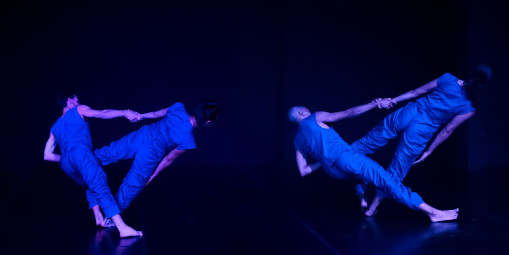 First to precipice (although why the title should have a lower case p is not clear). The work premiered in 2014 and has previously been revived in Perth, so it comes fully formed. It opens in lengthy silence with four dancers each standing at the end of a large cross on the floor. The two women and two men (Storm Helmore, Yilin Kong, Tyrone Robinson, Imanuel Dado) are dressed identically in blue trousers and tops that don’t draw attention to the anatomy. The dancers look sleek and somewhat androgynous and anonymous.
