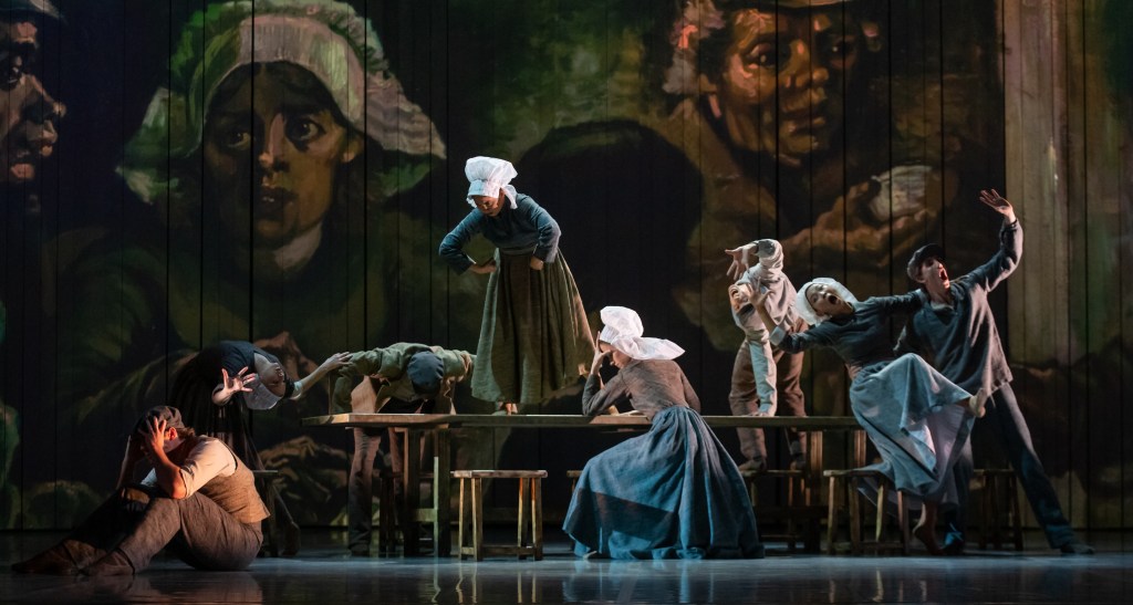Other company members embodied characters from paintings – the evocation of The Potato Eaters is sumptuous – or more abstract ideas as in the striking Act II scene that puts some dancers in swirling sunflower-yellow skirts and others in crow-black garments and beaked headwear.