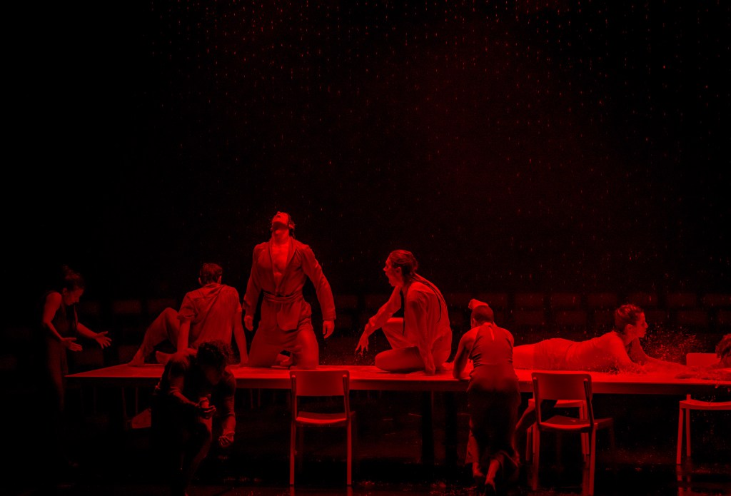 Water falls almost constantly on the performers, six dancers from ADC (Gabrielle Nankivell, Chase Clegg-Robinson, Harrison Elliott, Jack Lister, Jag Popham, Lilly King) and two independent artists (May Greenberg, Paul Zivkovich). All are extraordinary as they hang on to each other, slipping, sliding, running, standing defiantly or simply embracing or holding hands as the table turns and turns.