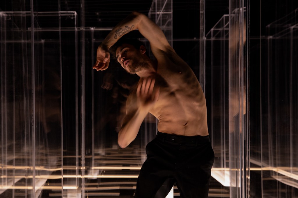 This section takes the wide-angled view of humankind’s extinction. The world is in extremis and the audience has a ringside seat from which to watch the obliteration. The ADC dancers are our proxies as they appear and disappear at various levels of the maze until it’s clear survival isn’t possible. A man crouches in child pose, his back undulating as if in a state of deep terror. Anguished faces press against the perspex and look less human. People cling to one another desperately.