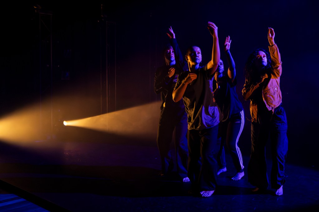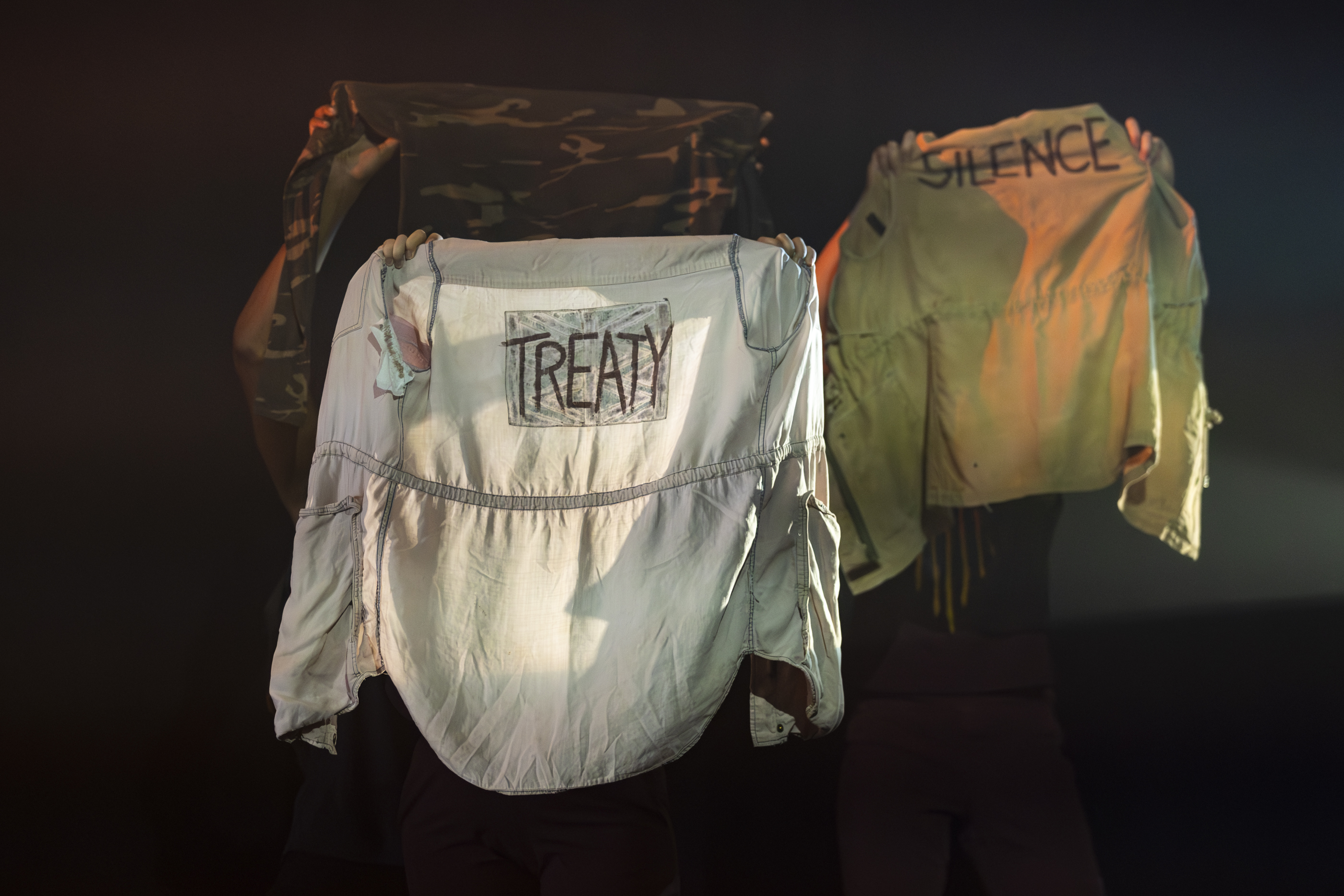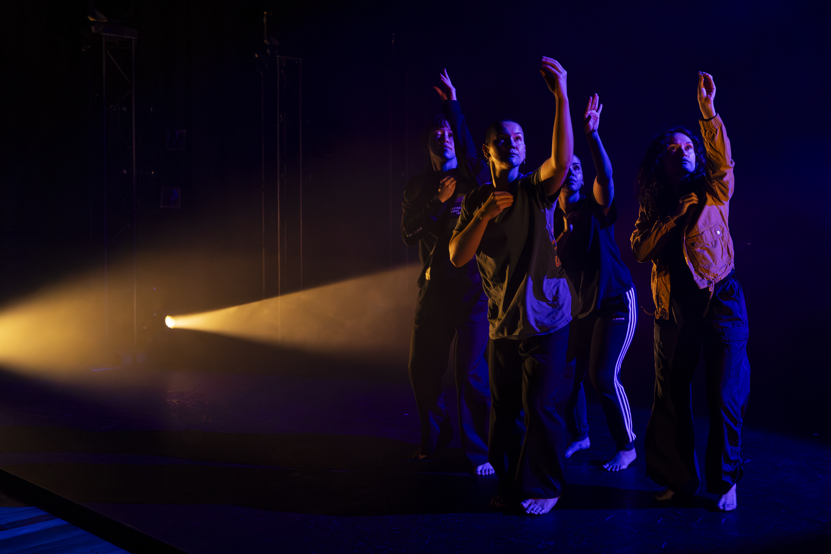 The hour-long piece is a smartly crafted mix of music, satire, humour, polemic and dance, the latter slipping powerfully between strong contemporary moves and shapes that evoke traditional ceremony. There is extremely effective support from Sam Pankhurst’s soundscape, which includes natural sounds, and Karen Norris’s spare lighting.