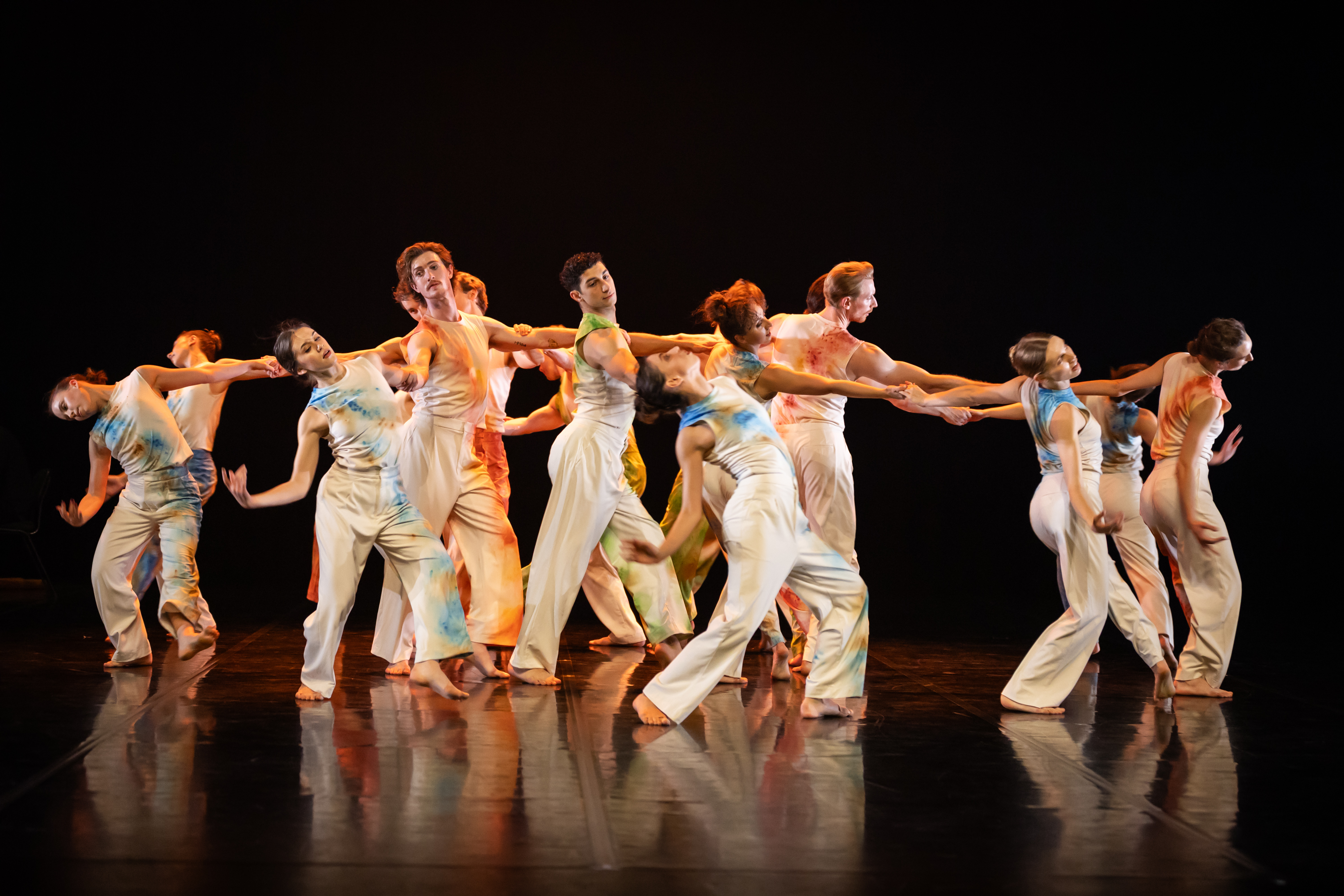 The butterflies of the title aren’t exactly the gentle, fluttery creatures one might first think of. Papillon takes a muscular, metaphorical look at a life cycle that requires larvae to fight their way into the light. There wasn’t a wasted moment in a work lasting a touch over 20 minutes. It was a story of struggle, emergence and flight, each section brought to energetic life by 10 of QB’s Jette Parker Young Artists who were joined on opening night by two Pre-Professional Program dancers. Their roomy layered pants in butterfly-worthy colours were designed by Lister and Zoe Griffiths and looked fabulous, as did all these young women and men.