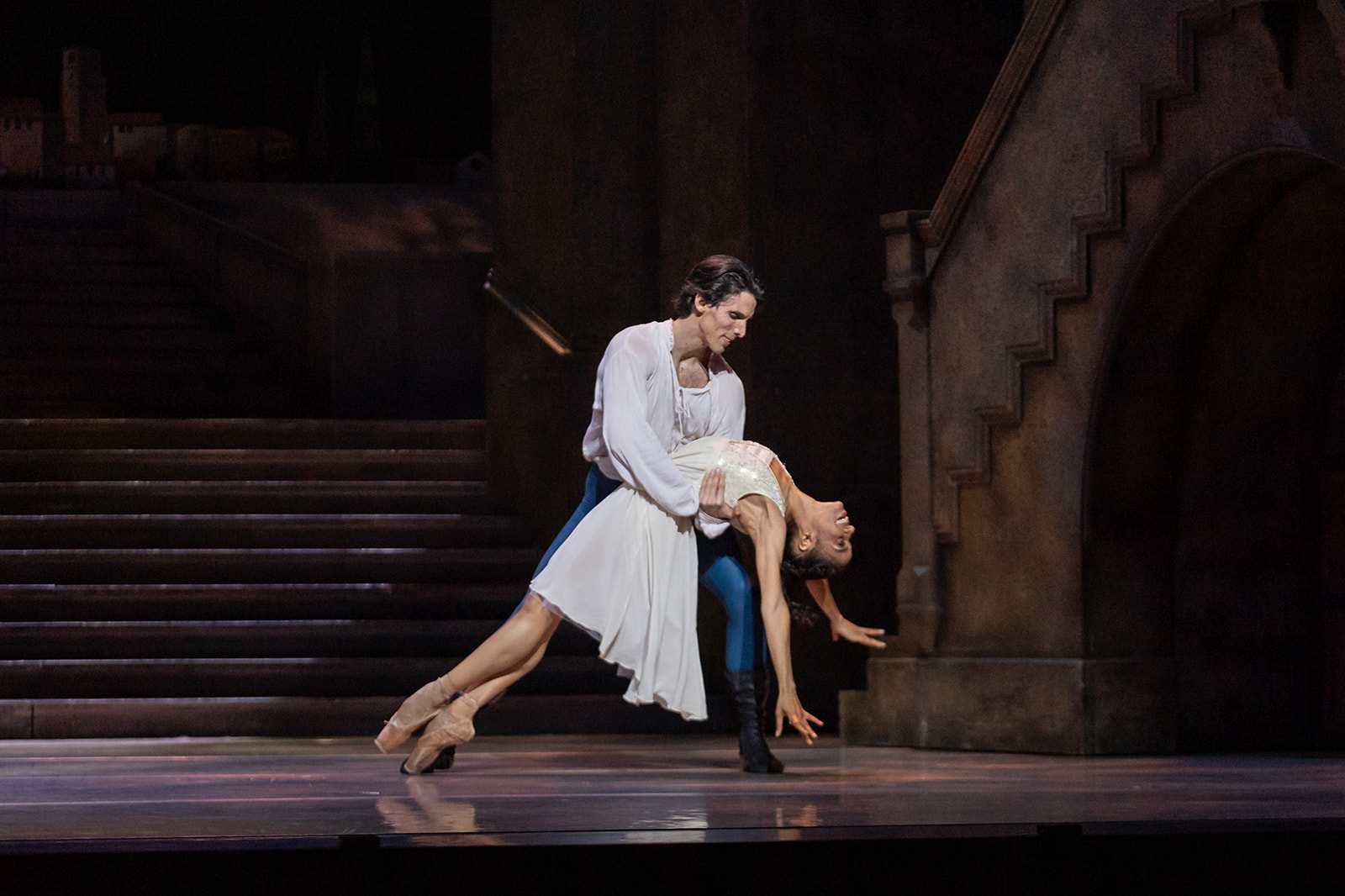 The time and place are Shakespeare’s. Fifteenth-century Verona looks aristocratic and monumental with great arches, a wide central staircase, tall columns and glimpses of Renaissance buildings and art. Scene changes have a dreamlike quality as panels float to create new spaces. There is high (literally) drama when Juliet first appears for the balcony scene, Rapunzel-like, in an opening carved out of a tall, otherwise faceless tower.