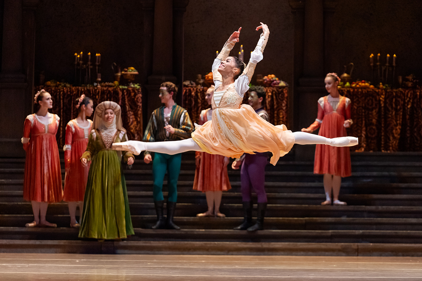 Principal artist Valdés was a dashing, ardent lover and Hardy Acuña delicately but clearly made her preferences known. When she danced with Charles Dashwood’s imposingly tall Paris at her father’s ball he kept looking at her and she avoided his gaze. Rahimi is still in the corps so Romeo is a huge break for him. He took a moment or two to get his bearings at his first performance but his youthful simplicity was tremendously appealing, his dancing airy and his partnering excellent. Nomura was more at home with Juliet’s tragedy than her early flowering of love.