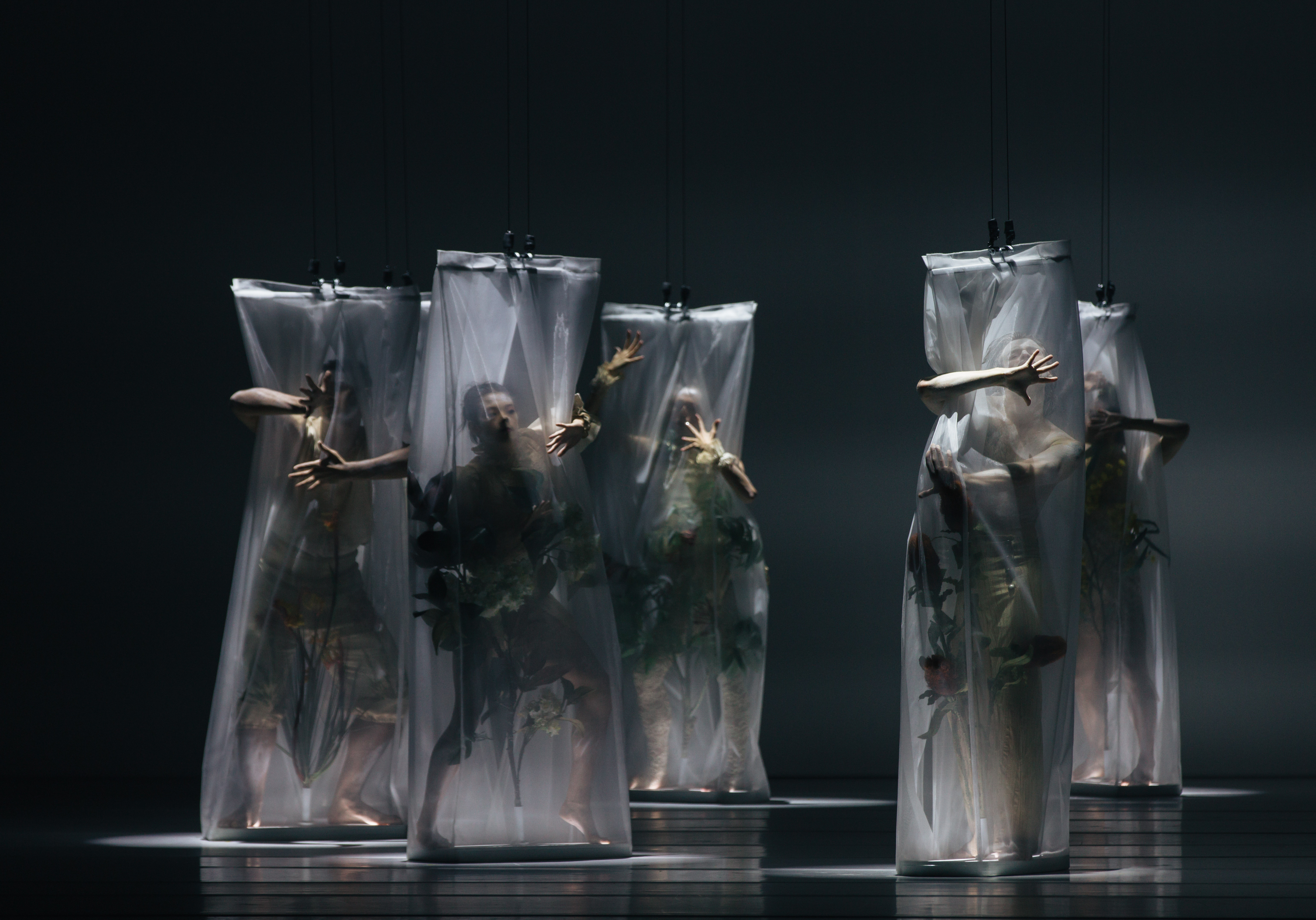 Bangarra is known for its visual poetry so it’s no surprise that Flora is exceptionally beautiful. Each scene is an exquisite moving picture. In an early section a clutch of people – mostly upside down – hangs from a huge arch of root tendrils. They then separate to form a Matisse-like circle and a ravishing curved line. Later dancers are enclosed in individual transparent envelopes, signifying the gathering of plant specimens by Joseph Banks and by extension the despoiling of this unique environment.